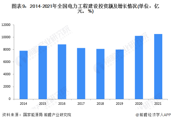 2014-2021年,我国电力工程建设投资额呈现波动增长态势,具体表现为在五年规划的前两年,电力工程建设投资额相对较高,随后的年份电力工程投资额相对较低,体现了一定的周期性特征。2021年我国电力工程建设投资额为10481亿元,同比增长2.9%。