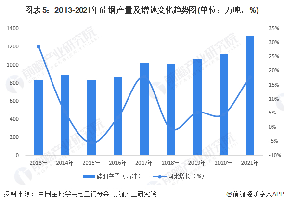 输配电设备主要原材料为硅钢,硅钢因其生产工艺复杂,制作技术严格,被称为钢铁产品中的“工艺品”。由于我国炼钢技术的不断进步,硅钢产线数量不断增加,我国硅钢的供给基本上能够满足国内的需求。2013-2021年,我国硅钢产量总体波动抬升,2021年我国硅钢产量约1328万吨,同比增长17.9%,其中取向电工钢约180万吨,增长14.26%;无取向电工钢约1138万吨,增长18.5%。