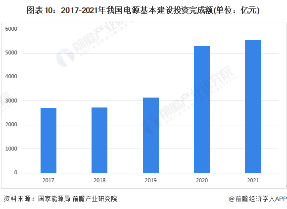 2017-2021年,我国电源基本建设投资完成额总体逐年提高。2020年我国电源基本建设投资完成额为5244亿元,同比增长67%;2021年我国电源基本建设投资完成额进一步提高,达5530亿元,同比增长5%。