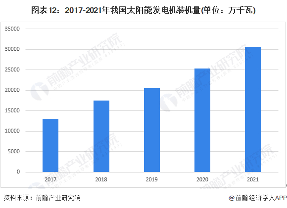2017-2021年,我国太阳能发电机装机量逐年快速提高。2021年我国太阳能发电机装机量为30656万千瓦,同比增长20.96%。