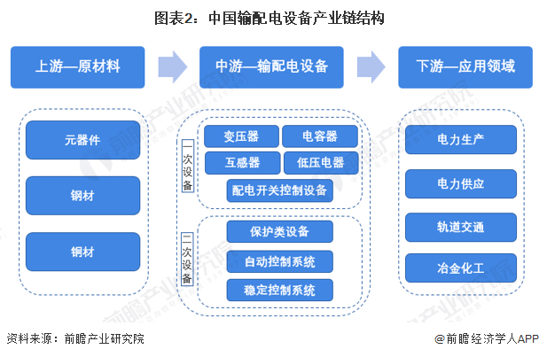 输配电设备产业链上游主要包括钢材、铜材、元器件等输配电设备生产所需原材料;输配电设备厂商可分为一次设备及二级设备厂商;输配电设备下游则主要是用电领域,包括电力生产、电力供应、轨道交通等等。