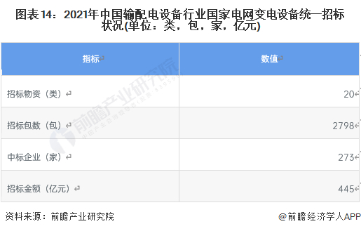 2021年国家电网变电设备统一招标20类物资2798包,招标金额共计445亿元。其中共有273家企业中标。273家中标企业中,146家过5000万元,97家过1亿元,46家过3亿元,29家过5亿元,6家过10亿元,最高的一家过15亿元。前100强合计中2007包3861082万元,占总金额的86.8%,集中度较高。