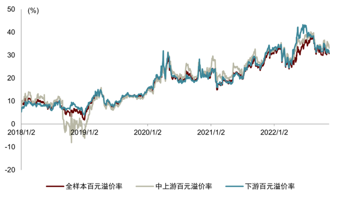 更进一步地,我们可以将转债表现的分化进行拆分,从正股与转债估值两个维度来观察转债分化的情况。我们首先通过两类转债的百元溢价率来判断上下游转债的估值水平是否有明显的分化,可以看到中上游转债和下游转债的百元溢价率在大部分时候几乎没有差别,仅在中上游转债明显占优的3Q20至4Q21期间偶尔出现中上游转债百元溢价率超过下游转债的情况,超出的幅度最高可达5pct,但是每次持续的时间都较短。由此可以判断,转债的上下游市场表现分化主要还是由正股的表现分化驱动的,估值水平的分化更多是由市场情绪推动的短期结果。