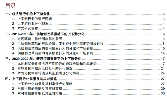 我们后文重点回顾上下游分化历史,展望未来上下游回归路径,并探讨其中蕴含的投资机会。具体来讲,在第二章中,我们重点讨论2016-2018年的上下游行业分化,回顾这个过程中利率债、信用债和可转债的表现;在第三章中,我们重点讨论2020-2022年的上下游行业分化,并回顾这个过程中各个债券品种的表现;在第四章中,我们展望本轮上下游行业分化的收敛路径,并探讨各个债券品种的策略应对。