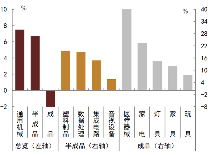 资料来源:Wind,中金公司研究部;注:半成品包括塑料制品、自动数据处理设备、集成电器、音视频设备、汽车零配件、液晶显示板、铝材、钢材和纺织纱线等。成品包括家电、家具、灯具、服装、陶瓷、汽车、船舶、鞋靴、手机、箱包等。