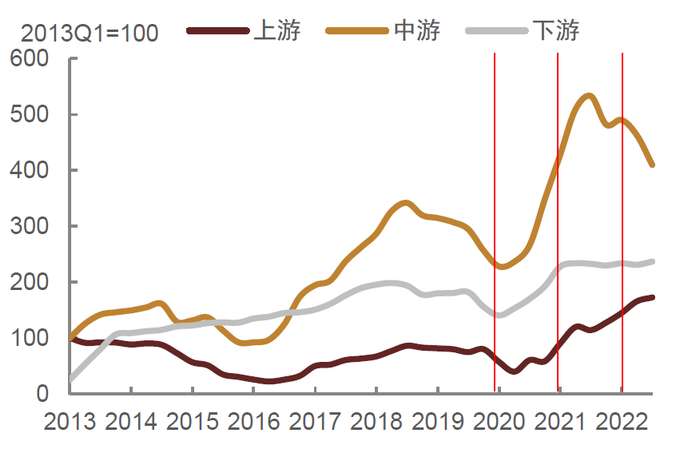 2022年我国上下游行业利润延续了2021年下半年以来的分化态势,即利润进一步向上游倾斜、中下游利润占比继续下滑,特别是中游利润受到较大侵蚀;但与2021年不同的是,今年利润整体增速也明显放缓。具体而言,仅上游利润增速仍然较高,中、下游行业利润的绝对规模均呈下降趋势,在此情况下上游行业利润占比仍在相对高位,但中游行业明显下降,下游行业占比从趋势上来看虽好于中游但也仍在近年来相对低位。进一步拆分来看,上游行业整体利润占比之所以仍高,主要是由于能源行业利润虽有所下滑但仍在高位,剔除能源外的其他上游行业利润实际上增幅有限;中游行业盈利则整体承压;下游行业中,则是资本品行业利润表现相对尚可,但消费品行业利润明显下降。上市公司盈利情况也印证了这一分化趋势。以2013年一季度为基期,年初以来上游行业上市公司净利润延续了2021年四季度以来的上升趋势,但与此同时中游行业上市公司净利润明显下滑,下游则基本持平于去年。从近期数据来看,随着上游商品价格回落,上游利润占比已有所下降但幅度有限,中游则继续承压,下游虽有起色但仍有待进一步回升,整体而言目前上下游分化程度仍较高。