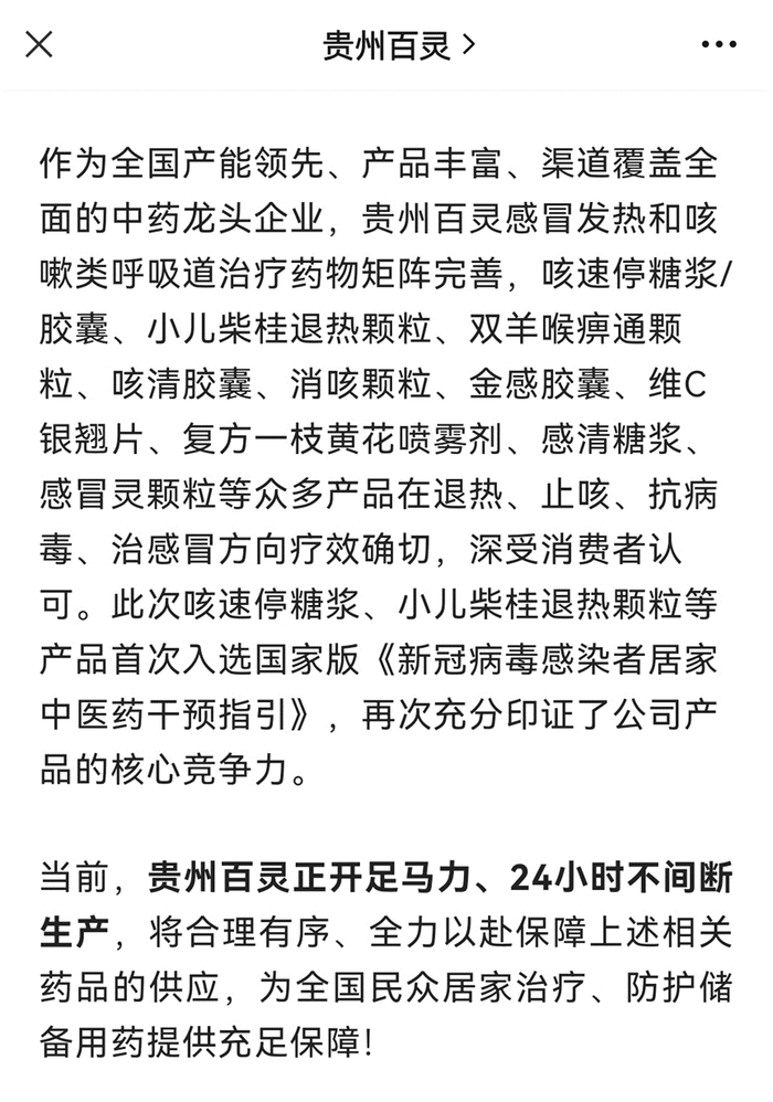 当前,贵州百灵正开足马力、24小时不间断生产,将合理有序、全力以赴保障上述相关药品的供应,为全国民众居家治疗、防护储备用药提供充足保障。