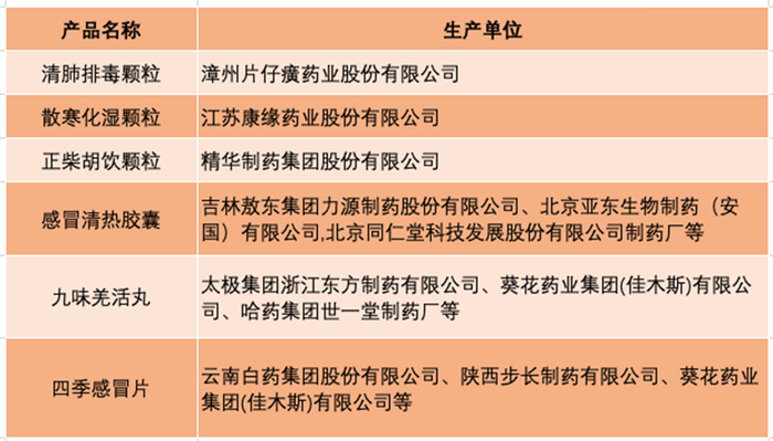 感冒清热胶囊、九味羌活丸、四季感冒片的获批厂家较多,生产单位涉及吉林敖东、太极集团、葵花药业等多家上市公司。