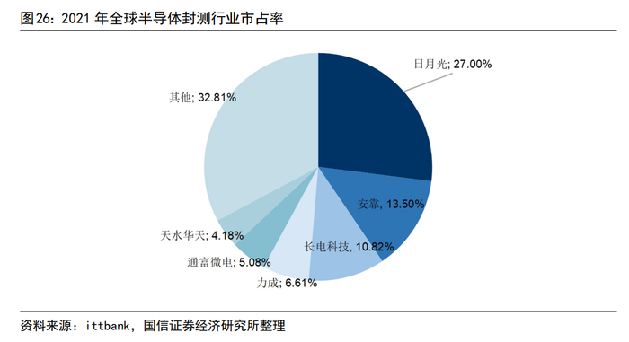 根据ittbank的统计,2021年全球封测行业前五大厂商合计市占率为63%,其中排名第一的日月光市占率27.0%,安靠、长电分别以市占率13.5%和10.8%排名第二和第三。在全球前十大厂商中,中国A股公司长电科技、通富微电、华天科技分别排名第三、第五和第六。