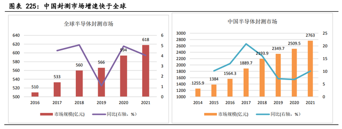封测环节是集成电路产业链的保障。东方财富证券指出,中国封测行业在2014-2021年各年均持续保持正增长,2021年市场规模达到2763亿元,2016-2021年平均年增速为12.1%,显著高于全球增速,封测领域本土化形势较好。