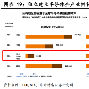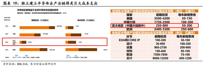 如今,东南亚正成为芯片巨头押注的宝地。东南亚具有独特的中立区域定位,在全球半导体生产线和供应链中发挥重大作用,并深度融入全球价值链。东方财富证券分析师曲一平11月22日发布的研报指出,测算各地区半导体产业链实现自给自足所需成本,亚太地区(中国大陆除外)前期投资拥有最大优势,每年新增费用也相对较低。