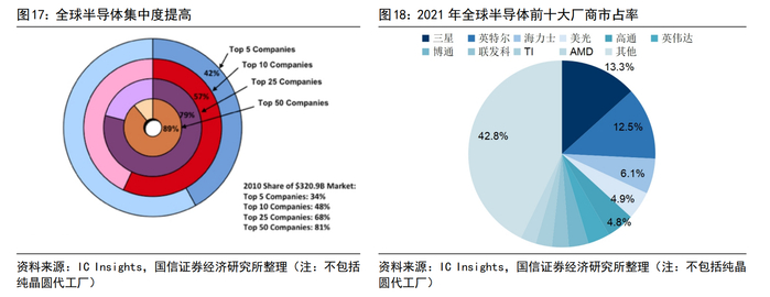 半导体行业包括设计、制造、封测三个环节,企业经营模式分为IDM(垂直整合制造)和垂直分工两种。整体来看,2010年以来半导体市场集中度有所提高,IC Insights认为,随着未来几年的并购继续发生,顶级供应商的份额可能提高到更高的水平。2021年前十大厂商分别为三星(13.3%)、英特尔(12.5%)、海力士(6.1%)、美光(4.9%)、高通(4.8%)。