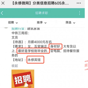 有网友称,不仅“五官端正,身材好,最好是学校刚毕业的”要求属实叫人想不到,地址一栏的“永修宾馆”也让人产生无限遐想。被网友向当地政府举报后,发布上述招聘信息的中铁三局昌九高铁CJZQ-3标项目部发表致歉声明,称该招聘信息措辞不当。
