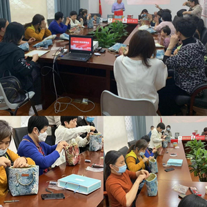 在制作油画风托特包的环节,由手工老师讲解制作油画风托特包的小知识,然后老师一步一步教客户们怎么从一针一线,到缝制包边,最后呈现出完美的成品。经过穿针、缝制、打孔等一道道工序,不一会儿,一个个精美的油画风托特包就做好了,制作过程中充满了欢声笑语。客户对自己的作品也非常满意,纷纷拍照留念。