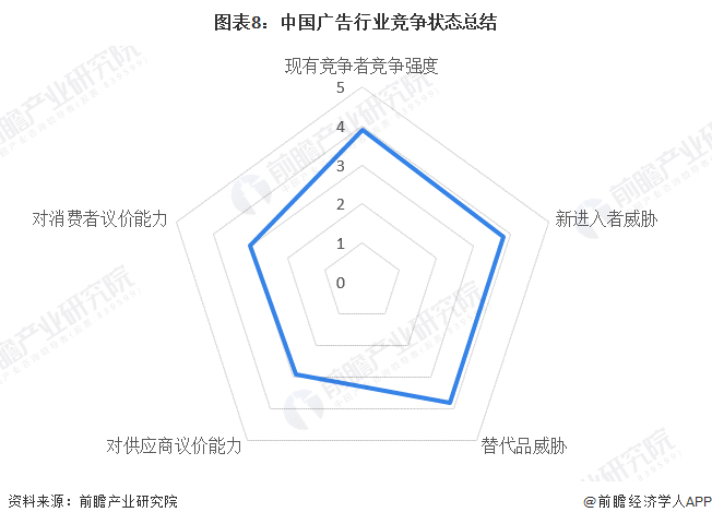 根据以上分析,对各方面的竞争情况进行量化,5代表最大,0代表最小,广告行业的竞争情况如下图所示。