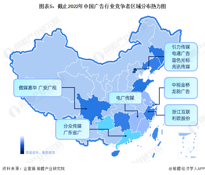 根据企查猫提供的信息来看,我国广告行业主要竞争者多聚集于广东、上海以及北京等地,其中分众传媒和南方新媒体等龙头企业在广东布局,中视金桥、龙韵广告等聚集在上海区域: