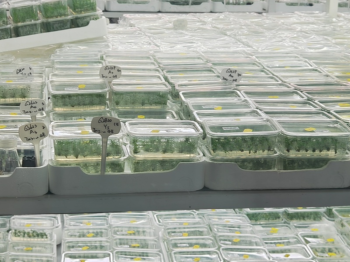 在位于鲜花港的凤梨种苗实验室里,工作人员穿着白色工作服,先把培养基注入组培盒中,再用消毒过的小刀和镊子,将经过切割后、仅有几毫米大小的凤梨单株放入培养基。这一过程,称为扩繁。