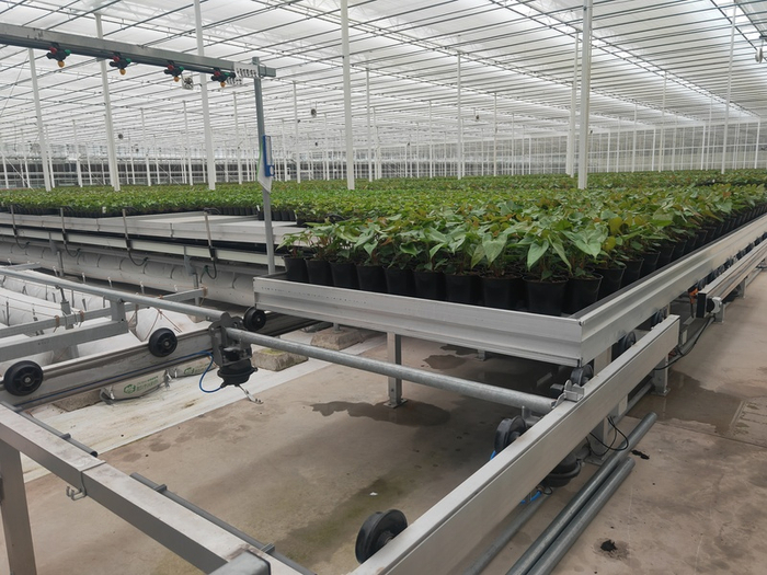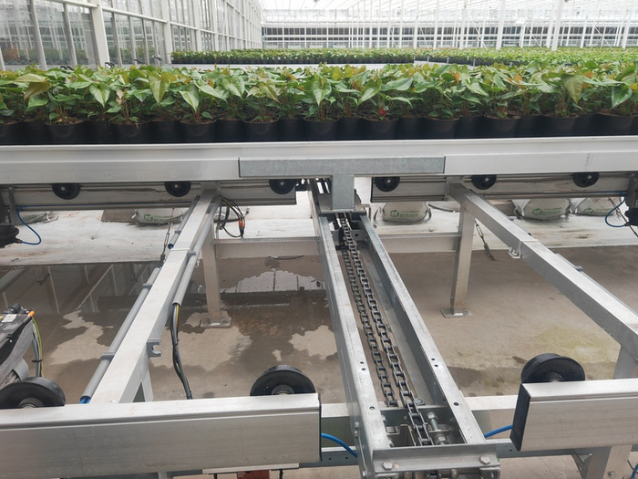 记者看到,种植区的花卉不是生长在田地里,而是排列在盛有专用基质土的花盆内,整齐地置于苗床之上。技术人员正在现场调试设备,在他们的操控下,一个个苗床就像是拼图一般,随着下方的齿轮实现移动。
