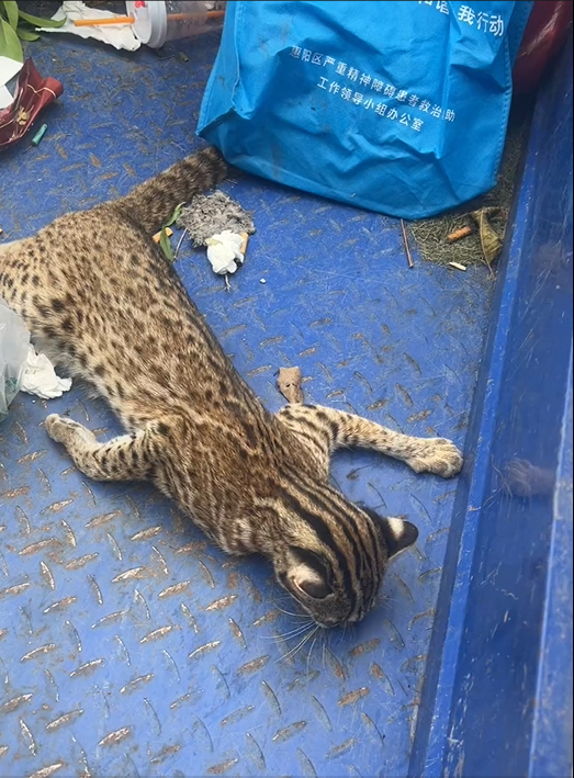 12月11日,一则“豹猫疑似中毒”的视频在网上流传。视频中,广东惠州人民公园内,一只豹猫趴在环卫工人的垃圾运输车上,全身抽搐。上传视频者在配文中提到:“人民公园发现一只豹猫,国家二级保护动物,估计中毒了。”