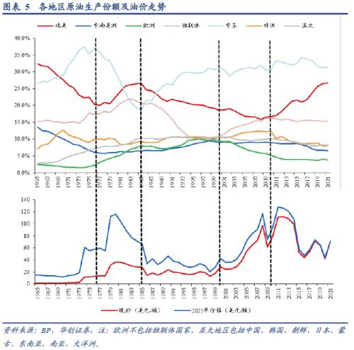 4)1980年代中期至2000年前后,独联体和北美产量占比见顶回落,中东产量占比大幅提升。为保护国内原油资源和生态环境,从1980年代初开始,美国开始禁止开采近海石油资源并实行“舍近求远”战略,原油产量一直下滑至2008年,这也导致北美产量占比的持续回落。前苏联解体导致独联体地区的产量及占比也大幅下滑,期间,中东调补了两者的缺额。