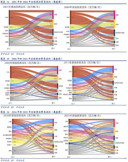 1990年代往后,大致是这一格局的强化:随着以中国为代表的亚太经济体进一步发展,亚太地区的原油消费量占比持续攀升,中东销往亚太的原油占比也提升至70%以上,并且非洲、中南美洲和独联体地区销往亚太的原油占比也在快速增长。我们刻画的2001-2021年全球原油贸易流向的桑基图也体现了这一点。