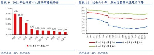 集中性体现在,前10个国家消费量占全球比重在60%左右,前20个国家消费量占比约75%,前30个国家消费量占比约85%。值得一提的是,从上世纪中期以来,原油消费的集中度是趋于下降的,这与全球经济的多极化发展相符。