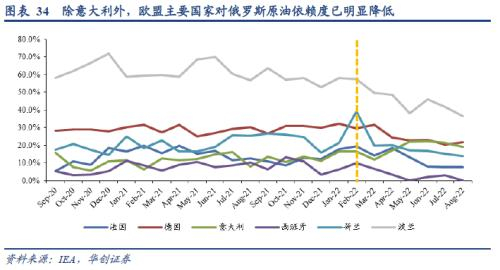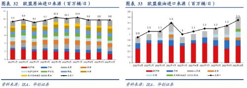 此外,欧盟对俄罗斯石油产品的进口尚未明显减少。以柴油为代表品类(欧盟对俄柴油进口在对俄油品进口中的占比接近50%),1-2月进口量约60万桶/日,9-10月仍保持在这一水平。不过,最近两个月,由于法国炼厂罢工和季节性检修、在明年2月前重建油品库存的因素,欧盟柴油进口量较1-2月提高了50%,达到150万桶/日左右。对俄罗斯柴油的进口依赖度被动地从冲突前的60%降至了40%。