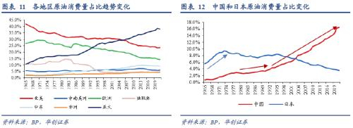 而随着亚太经济的崛起,消费占比基本逐年提升。在1970年代中期以前,日本经济增速较快,是消费占比提升的主要贡献;在1980年代后,日本经济逐渐式微,而我国在改革开放后经济进入快速发展期,接替日本继续推动亚太地区原油消费占比上行。此外,中东地区的原油消费量占比也从1970年代的2%左右提高至目前的10%左右,一方面是经济发展建设的需要,另一方面就是对石油产业链的向下延伸。
