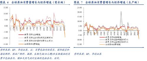 一是全球原油消费增速与全球经济增长基本吻合。全球原油消费量总体呈不断增长态势,与经济增速高度一致,自1971年至今,全球原油消费量增速与实际GDP增速、消费支出增速、资本形成增速、制造业增加值增速、服务业增加值增速的相关系数分别为0.86、0.85、0.68、0.56、0.76,原油消费量与消费(需求端)和服务业(生产端)增速关系更密切,这与我们下面提到的原油消费分部门结构相关。