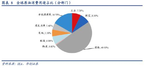 二是原油消费中,交通用燃料占绝对主导。大类看,燃料用途占83%,非燃料用途(石化)仅占约17%;细分看,道路交通用燃料占比约50%,航空和航海合计占比约15%左右,居民用燃料占比约5.4%。以交通运输燃料为绝对主导的消费结构,也解释了为什么原油消费增速与消费和服务业增速更相关。