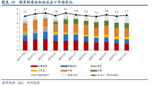 从俄罗斯视角看,俄罗斯对西方国家的原油和原油产品出口大幅下降,对印度、土耳其和中国出口明显增加,还有部分增量流向未知。对比今年1-2月和9-10月,俄罗斯对欧盟出口下降了约150万桶/日(油品占了约50万桶/日),对英美出口从80万桶/日降至零,对OECD亚洲国家出口也从50万桶/日降至零左右。另一方面,对印度(+100万桶/日)、土耳其(+30万桶/日)和中国(+20万桶/日)的出口有明显增长,对未知目的地的出口增量接近70万桶/日,这部分大概是通过影子贸易流入了欧盟和亚太等地。基于出口市场的调整,目前,俄罗斯原油及油品出口量仅较俄乌冲突前下降了40万桶/日左右。