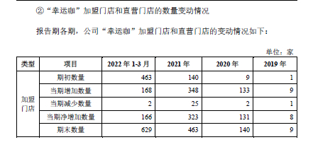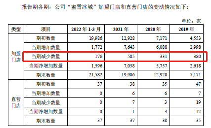 同时,“蜜雪冰城”的关店也值得关注。招股书显示,2022年1-3月减少176家,占当期增加数量约为10%,占比远高于2020-2021年。