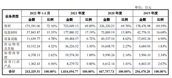 蜜雪冰城的主营业务收入构成的前两项,分别为食材、包装材料。招股书显示,2022年1-3月两者占比分别为72.16%、15.55%,合计87.71%。从过去三年来看,两者对蜜雪冰城的收入贡献比例均超过85%,即加盟商的原材料采购收入是蜜雪冰城业绩的主要贡献。