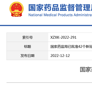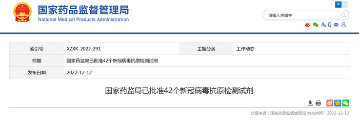 12月12日,经国家药监局审查,批准郑州安图生物工程股份有限公司和厦门为正生物科技股份有限公司的2个新冠病毒抗原检测试剂产品。截至目前,国家药监局已批准42个新冠病毒抗原检测试剂产品。