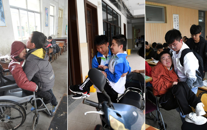教室总在一楼,座位总是第一排,出门总有同学帮忙,轮椅后总有双温暖的手——从小学、初中到高中、大学,程东东身边始终有一群同学守护着他,用一个个爱心的接力,实现着他的求学梦。