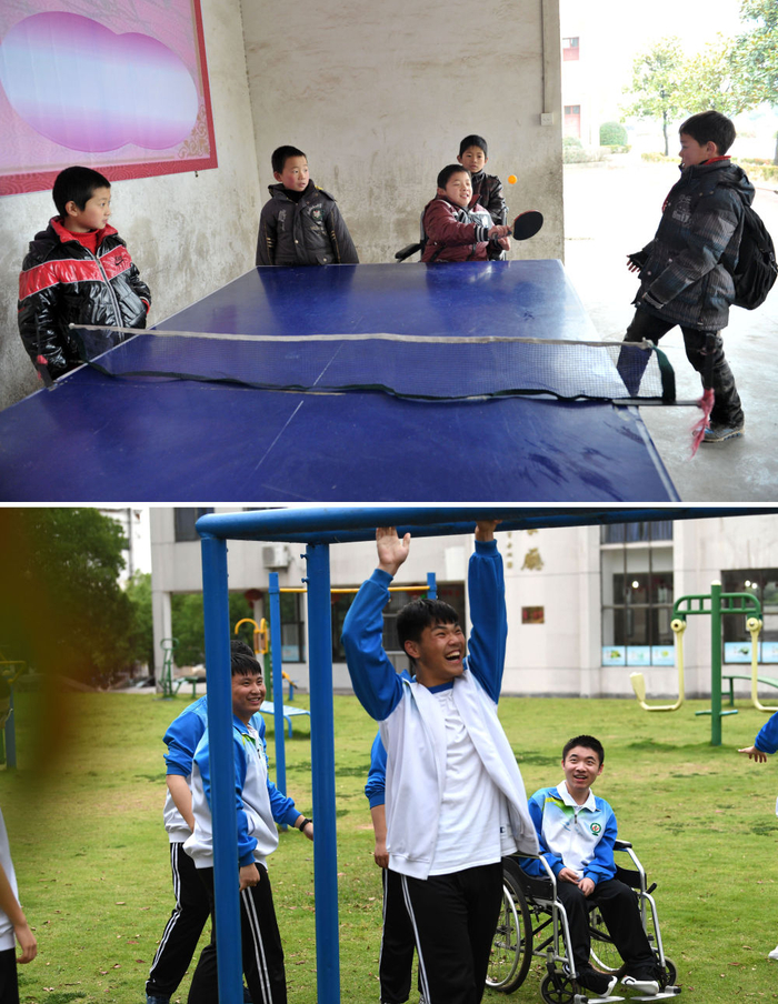 ↑拼版照片上图:在广德市邱村镇中心小学,程东东和爱心帮扶小组的同学一起打乒乓球(2012年3月3日摄,受访者供图);下图:在广德中学,程东东和爱心帮扶小组的同学一起在操场上玩耍(2020年5月28日摄)。