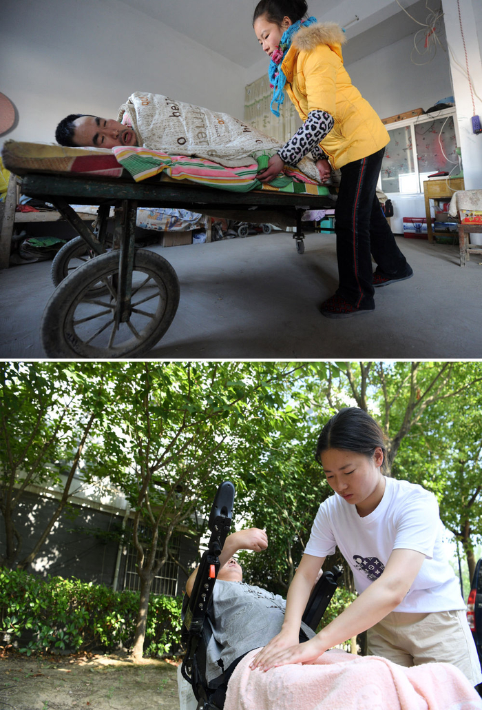 ↑ 拼版照片上图:14岁时的黄凤为躺在板车上的爸爸翻身(2011年1月1日摄);下图:2022年6月17日,黄凤为轮椅上的父亲做按摩。