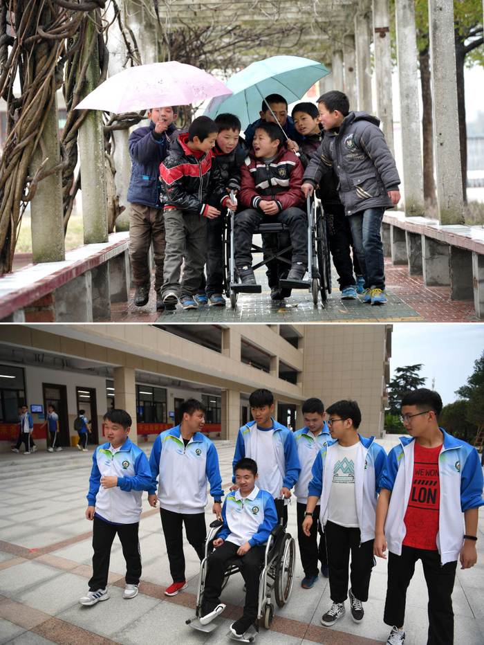 ↑拼版照片上图:在广德市邱村镇中心小学,爱心帮扶小组的同学陪程东东在校园里散步(2012年3月3日摄,受访者供图);下图:在广德中学,爱心帮扶小组的同学陪程东东在校园里散步(2020年5月28日摄)。