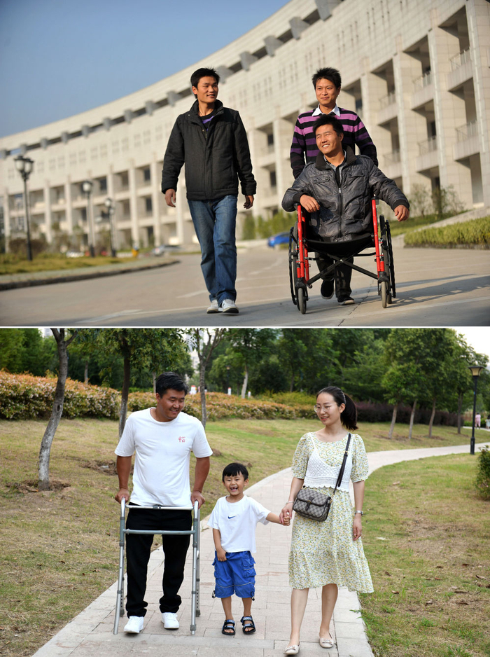↑ 拼版照片上图为:2011年10月31日,王雷和同学在安徽医科大学校园里(马杨摄);下图为:2021年8月15日,王雷和家人在濉溪县的一个公园里散步。