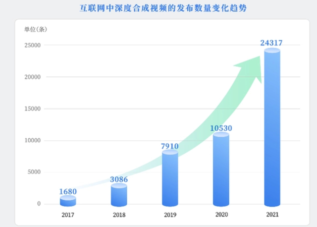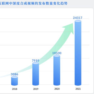 2022年2月,清华大学人工智能研究院与多家机构联合发布《深度合成十大趋势报告(2022)》(简称《报告》)。《报告》显示,在国内外主流音视频网站、社交媒体平台上,2021年新发布的深度合成视频的数量较2017年已增长超过十倍。此外,深度合成内容关注度也呈指数级增长,通过对互动数据进行统计,2021年新发布的深度合成视频的点赞数已超过3亿。