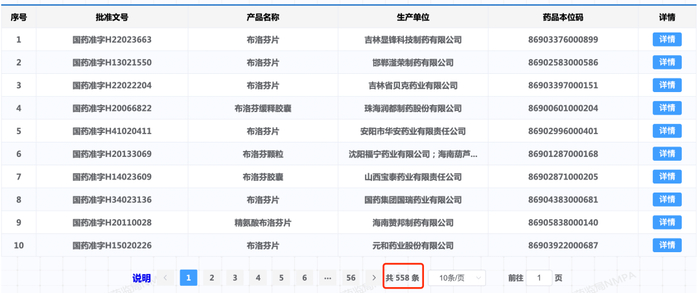 国家药品监督管理局数据查询网站显示,目前国内企业中拿到布洛芬的注册批文数量多达558个,但作为原料药生产商的新华制药、亨迪药业,则更为“受宠”。