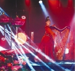 碧叶莲塘,雅乐声声,清雾袅袅,一个空灵静谧的意境呈现在观众面前,转眼清雾散去,一身红罗裙水袖的女子在舞台中央跳着汉代舞……魔术师李诺亚方舟在舞台上长袖当风,上下翻飞,与缥缈的音乐融于一体,团扇、莲花灯、琵琶、鼓等壁画中的乐器和道具一个一个神奇地出现在舞台上,立体呈现和艺术还原了辽阳壁画《百戏图》。
