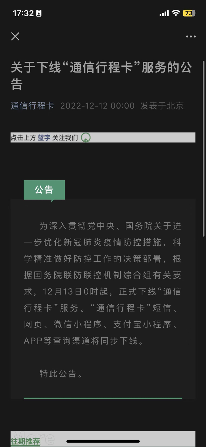 随着中国疫情防控政策的调整,已经在普罗大众生活中存在达两年九个月之久的“通信大数据行程卡”(下称“行程卡”),将于12月13日0时正式下线。