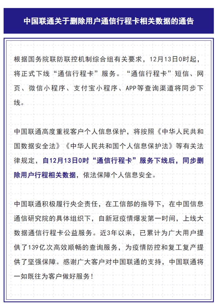同日,“中国联通”通过微信公号发布通告:中国联通高度重视客户个人信息保护,将按照《中华人民共和国数据安全法》《中华人民共和国个人信息保护法》等有关法律规定,自12月13日0时“通信行程卡”服务下线后,同步删除用户行程相关数据,依法保障个人信息安全。