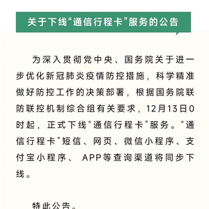 12月12日0时,“通信行程卡”微信订阅号发布《关于下线“通信行程卡”服务的公告》:12月13日0时起,正式下线“通信行程卡”服务。