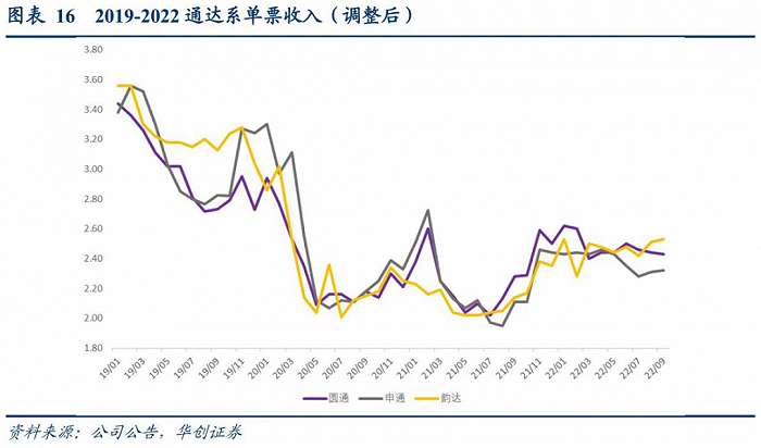 以圆通、申通、韵达为例。2019年1月,三家公司单票收入分别为3.44元、3.38元、3.56元。