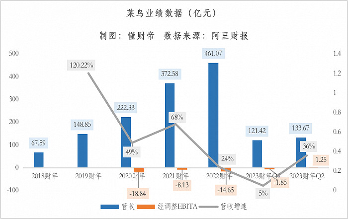 直到2023财年Q2(自然年:2022.7.1-9.30),菜鸟业绩才稍有回暖,季度营收为133.67亿元,营收增速回升至36%,但已不复此前的辉煌。经调整EBITA为1.25亿元,是近几个报告期内的首次盈利。
