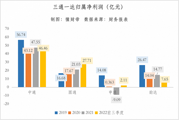归属净利润数据体现得更为明显。2019、2020、2021年,申通归属净利润分别为14.08亿元、3633万元、-9.09亿元,分别同比下滑31.27%、97.42%、2603.16%。