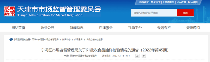 天津市宁河区市场监管局关于61批次食品抽样检验情况的通告(2022年第45期)