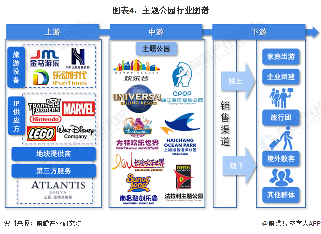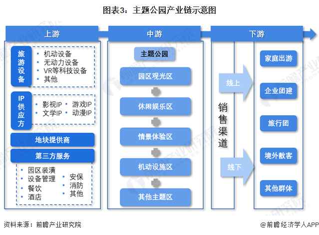 主题公园产业链,强调主题旅游、休闲娱乐、文化会展、住宅、商业、酒店等诸多产业的良性互动。上游为旅游设备、IP供应方、地块提供方和第三方服务等;中游是主题公园;下游是销售渠道和各类消费群体。